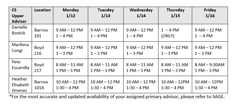 FOR INCOMING ORIENTATION STUDENTS All incoming First-Year and Transfer students will be advised at their in-person orientation session. Check out the New Student Orientation site for information about signing up for your orientation session and keep an eye on your inbox for new information. Advisors are not able to meet with incoming students or clear their registration holds before their in-person orientation session. Undecided Majors Unsure which major you want? It is OK to be Unspecified! Select an AB or BS Unspecified major in Athena. The Exploratory Center advises Unspecified/Undecided students. Request Appointment with an Explore Advisor FOR CURRENT STUDENTS All UGA students are required to be advised every fall and spring semester. You can’t register until you’ve had your advising appointment. Make an appointment shortly after drop/add to avoid a last-minute rush that might impact your ability to register on time. If you have questions about making an appointment, email your advisor. How to Find your Advisor in SAGE Make an Appointment in SAGE If you do not have an advisor in SAGE, please email csciadvising@uga.edu. Your advisor and advising location will be assigned based on your major listed in Athena and your number of earned credit hours. To meet with the correct advisor, make sure your major is correct in Athena. (Note: Students with more than one major should be advised in each department.) How to Check and Change your Major Changing your major: If you have recently changed your major but have not been assigned a new advisor, please contact csciadvising@uga.edu. Note: Students with more than one major should be advised in each department. FOR HONORS STUDENTS Honors advisors and advising locations vary by your major in Athena and the hours earned. Please refer to your SAGE network at sage.uga.edu to find your advisor’s contact information. For details, see the Honors website. Make an Appointment in SAGE